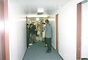 St. John's Instituteの廊下での一こま。 オリエンテーションディナーへフォーマルで行くべきか カジュアルで行くべきか相談しているところ。 |