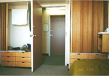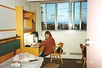 リスターホールの中。 2人部屋で机とベット、クローゼットが付く。シャワールームや 冷蔵庫、ランドリーは共用。 |