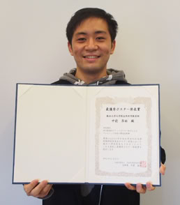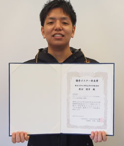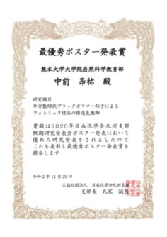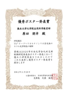 2020年日本化学会九州支部秋期研究発表会で中前 昂祐くん(M2)が最優秀ポスター発表賞を、原田 朋幸くん(M2)が優秀ポスター発表賞を受賞しました。おめでとうございます。普段から仲の良い二人なので、ここでも二人仲良くコンビ受賞となりました。仲が良すぎて、不・気・味☆