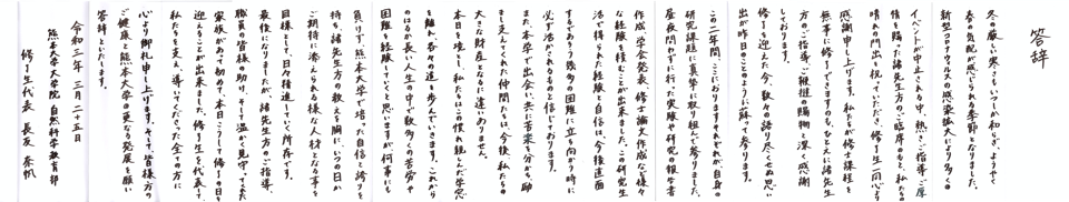 修士課程の卒科式では、なんと、我らが長友奈帆さんが答辞を述べました。