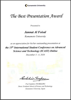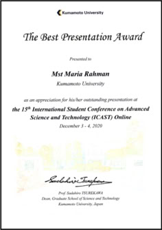 The 15th International Student Conference on Advanced Science and Technology (ICAST 2020)でMaria Mst. Rahmanさん(D3)とJannat Al Foisalくん(M2)がBest Presentation Awardを受賞しました。おめでとうございます。発表題目はそれぞれ「Fabrication of Hetero-Network Hydrogels Cross-linked with Silica Nanoparticles for Strategic Control of Thermal Responsive Property」と「Transparent high refractive index polymer hybrids with heteropoly acid」です。