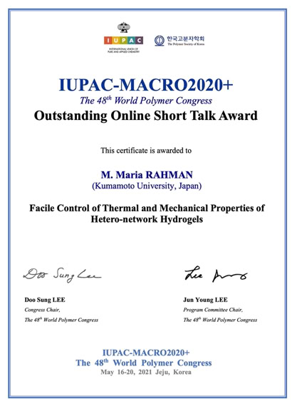 IUPAC-MACRO2020+ The 48th World Polymer CongressでMaria Mst. Rahmanさん(D3)がOutstanding Online Short Talk Awardを受賞しました。おめでとうございます。
