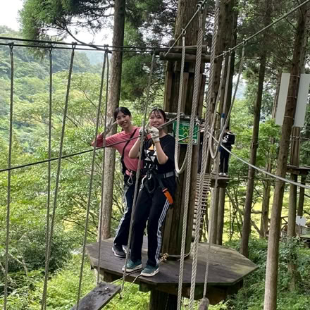 フォレストアドベンチャーでは仲間と声を掛け合いながらアスレチックに挑戦し、鯛生金山では砂金採り体験に夢中になりました。