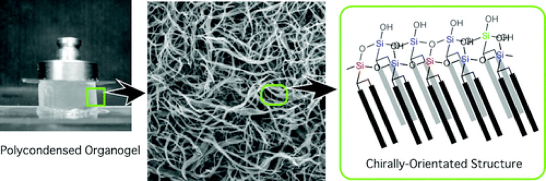 Polycondensation and stabilization of chirally-ordered molecular organogels derived from alkoxysilyl group-containing L-glutamide lipid.