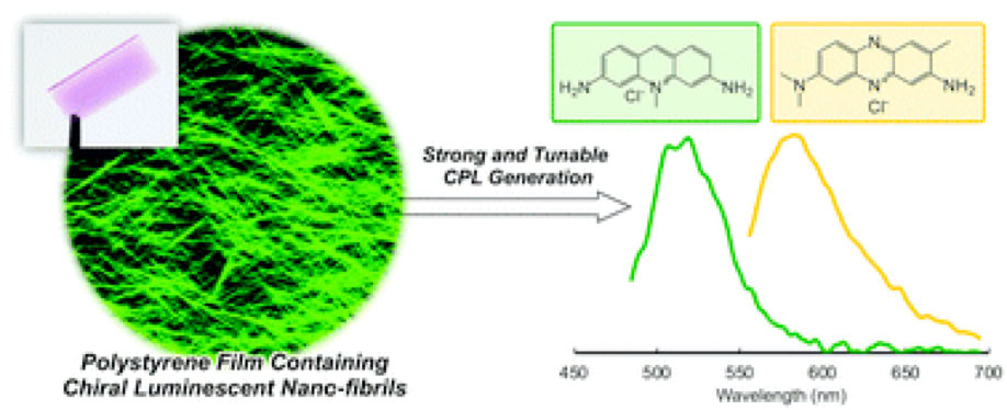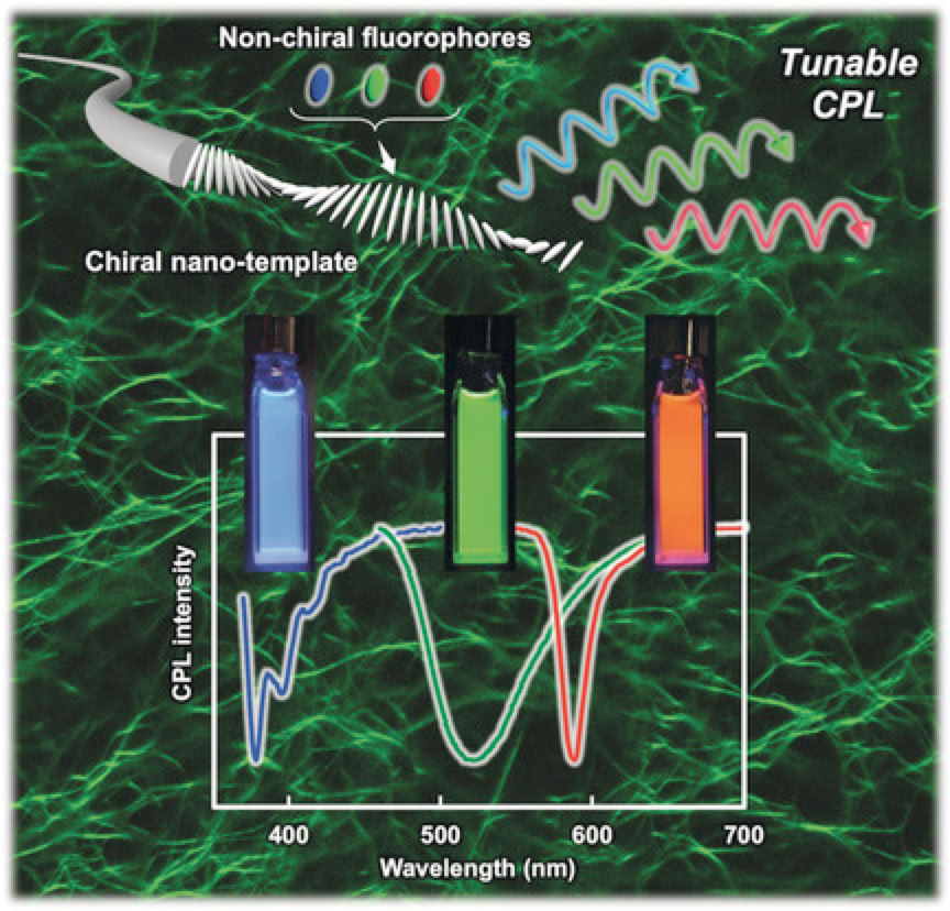 Induction of strong and tunable circularly polarized luminescence of non-chiral, non-metal, low-molecular-weight fluorophores using chiral nano-template.