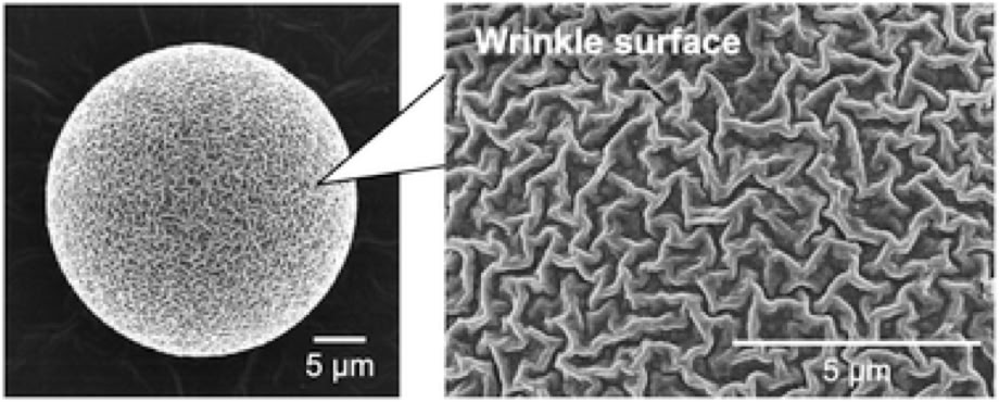 One-pot preparation of polymer microspheres having wrinkled hard surfaces through self-assembly of silica nanoparticles.
