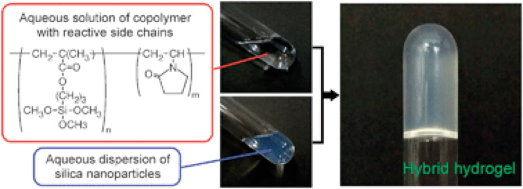 Novel hybrid polymer hydrogels were prepared in a facile manner by simple mixing of a water-soluble copolymer having trimethoxysilyl side chains with silica nanoparticles used as multiple crosslinkers.