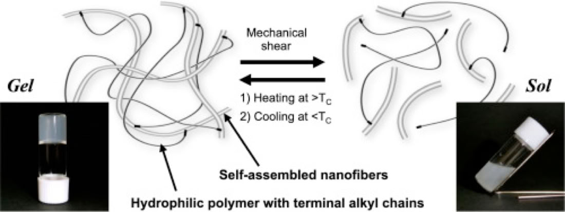 Hetero-network hydrogels composed of hydrophilic polymers with terminal alkyl chains and nanofibrous self-assemblies were successfully fabricated. The gel formation was not observed in both cases of the self-assemblies in aqueous solution and hydrophilic polymer in aqueous solution. Furthermore the gel-to-liquid crystalline phase transition temperatures of nanofibrous self-assemblies were lowered by addition of hydrophilic polymers with terminal alkyl chains. From these observations, it was considered that the alkyl chains at polymer termini intercalated into the bilayer membrane-based nanofibrous self-assemblies to form cross-linking points. As far as we know, the hybrid hydrogel introduced in this communication is the first example of a hetero-network structure composed of supramolecular assemblies. When the hetero-network hydrogel was crushed by mechanical shearing, these hydrogels recovered by heating at temperatures above their gel-to-liquid crystalline transition temperatures.