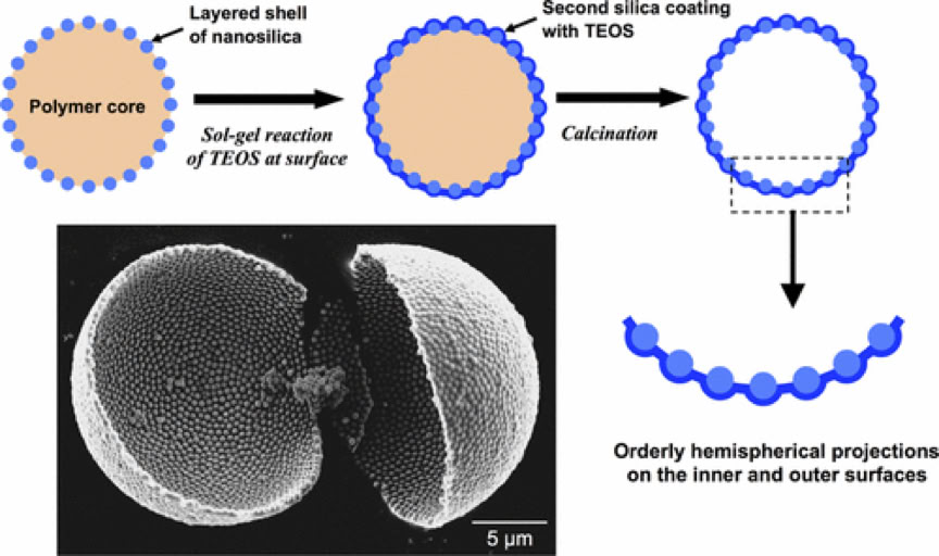 Fabrication of hollow silica microspheres with orderly hemispherical protrusions and capability for heat-induced controlled cracking.