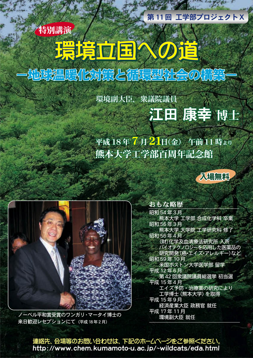 ご講演いただきます。皆様のご来場をお待ちしております。 | 7月21日(金)11:00〜12:30 | 熊本大学 工学部 百周年記念館(黒髪南地区) | 熊本市黒髪2−39−1(キャンパスマップ表示、交通案内) 環境立国への道ー地球温暖化対策と循環型社会の構築ー | 江田康幸 博士(環境副大臣、衆議院議員) |