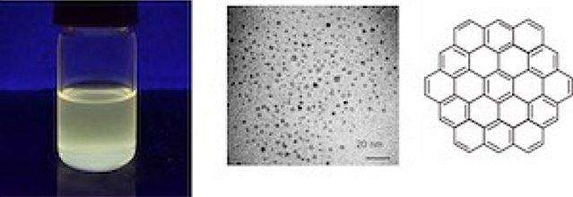 グラフェン量子ドットはナノサイズのグラフェンで蛍光を発したり、抗菌・抗ウイルス活性をもち、新たな医療材料として期待されています。私たちは独自の合成方法を見出し、その生成機構の解明から、医療材料としての応用まで幅広く研究を進めています。
