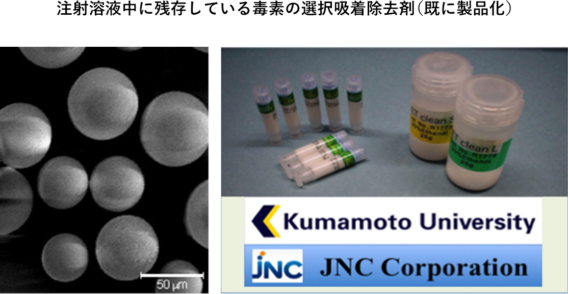 様々な機能を持った高分子を開発しています。そのひとつに、様々なワクチンや血液製剤などの注射溶液中に微量残存している毒素の選択吸着除去剤の開発があります。薬として有用な成分は吸着せずに、不要な、害となるものだけを選択的に除く機能を持った高分子を開発しています。選択的に、いらないものだけを除く技術は、高度な高分子構造の制御技術に支えられており、副作用の少ない安全な医薬品の開発に欠かせない技術となっています。